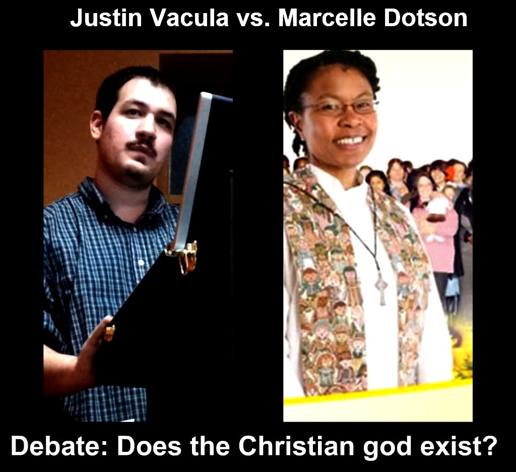 I debated Rev. Marcelle Dotson of Field of Grace United Methodist Church in Wilkes-Barre on the topic of “Does the Christian god exist?” on December 19, 2011.